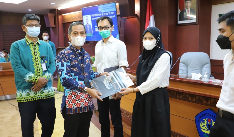 Newslampungterkini.com – Rektor Universitas Lampung (Unila) Prof. Dr. Karomani, M.Si., bersama Wakil Rektor Bidang Umum dan Keuangan Prof. Dr. dr. Asep Sukohar, S.Ked., M.Kes., dan Kepala Biro Umum dan Keuangan Ida Ropaida, S.E., M.M., menyerahkan SK CPNS bagi 31 orang CPNS Unila tahun 2022. Penyerahan dilakukan di ruang sidang utama Rektorat, Kamis, 12 Mei 2022.