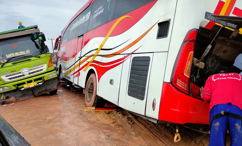 Bus Terjebak di Kubangan Lumpur Jalan Poros Rawajitu