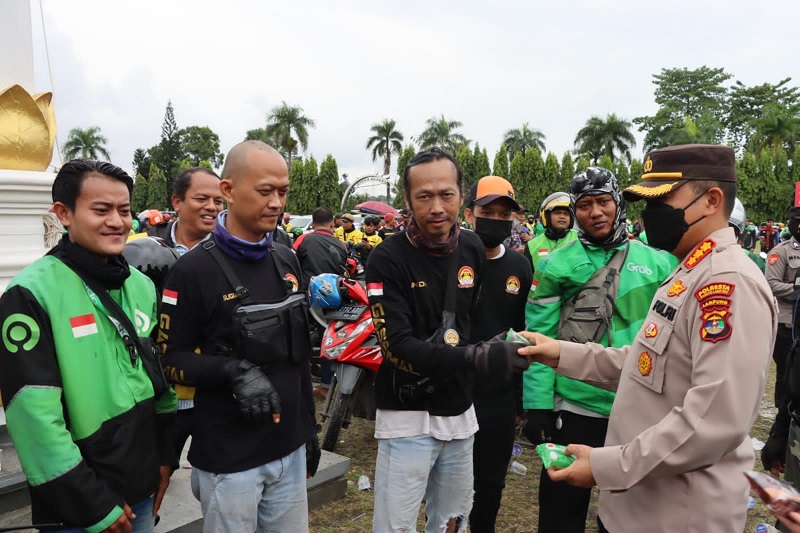 Dalam aksi demo tersebut selain melakukan pengamanan terlihat Polresta Bandar Lampung membagikan Air mineral dan snack kepada ratusan Pengemudi ojek Online di lapangan Korpri Kantor DPRD Provinsi Lampung Juga kepada pengunjuk rasa yang ada di Kantor DPRD Kota Bandar Lampung.