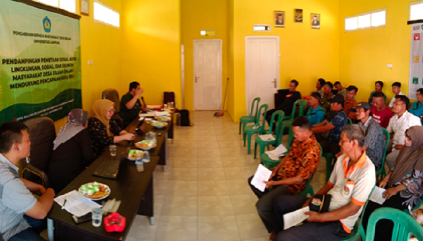 Salah satu tim pengabdi yang diketuai Wakil Rektor Bidang Kemahasiswaan dan Alumni Unila Prof. Dr. Yulianto, M.S., mengangkat tema Pendampingan Pemetaan Sosial Aspek Lingkungan, Sosial, dan Ekonomi Masyarakat Desa Kiluan dalam Mendukung Pencapaian SDGs Desa.