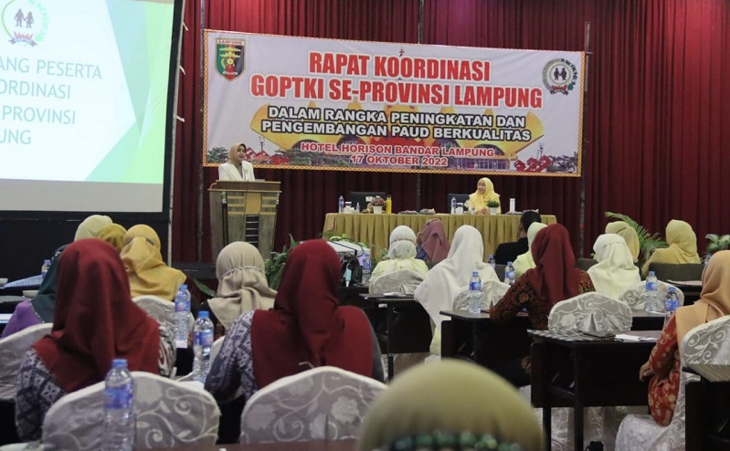 “Tujuan dari kegiatan ini adalah mengkoordinasikan program kerja DPD GOPTKI se-Provinsi Lampung, Evaluasi dan DPD GOPTKI pembinaan Kabupaten/Kota se-Provinsi Lampung, Pemahaman dan kesamaan persepsi melakukan tugas dan fungsi dalam peningkatan layanan pendidikan untuk anak usia dini didaerah masing-masing, Optimalisasi terhadap penyelenggaraan Taman Kanak-Kanak melalui kebijakan peningkatan mutu yang terarah dan terpadu, Penyusunan program kerja DPD GOPTKI tahun selanjutnya,” jelasnya.