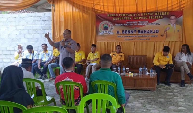 Newslampungterkini.com – Anggota DPRD Lampung Selatan Fraksi Golkar, Benny Raharjo menggelar sosialisasi Ideologi Pancasila dan Wawasan Kebangsaan (IPWK) di Desa Karang Anyar, Kecamatan Jati Agung, Lampung Selatam, Sabtu (18/2/2023).