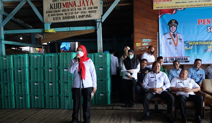 Newslampungterkini.com – Walikota Kota Bandar Lampung, Hj. Eva Dwiana memberi bantuan kepada 100 nelayan di pasar ikan Gudang Lelang, Kecamatan Bumi Waras, Rabu, (29/3/2023).
