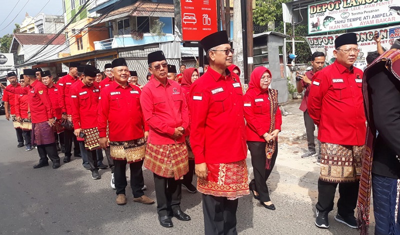 Alumni aktivis dari GMNI ini juga menggunakan pakain kain adat, serta peci berwarna hitam dan nampak mengikuti barisan bersama bacaleg lainnya dari PDI Perjuangan Provinsi Lampung.
