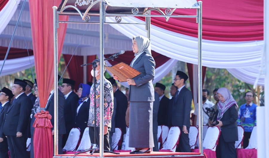 Newslampungterkini.com – Rektor Universitas Lampung (Unila) Prof. Dr. Ir. Lusmeilia Afriani, D.E.A., IPM., ASEAN Eng., memimpin upacara bendera peringatan Hari Kesaktian Pancasila di lapangan sepak bola Unila, Minggu (1/10/2023).