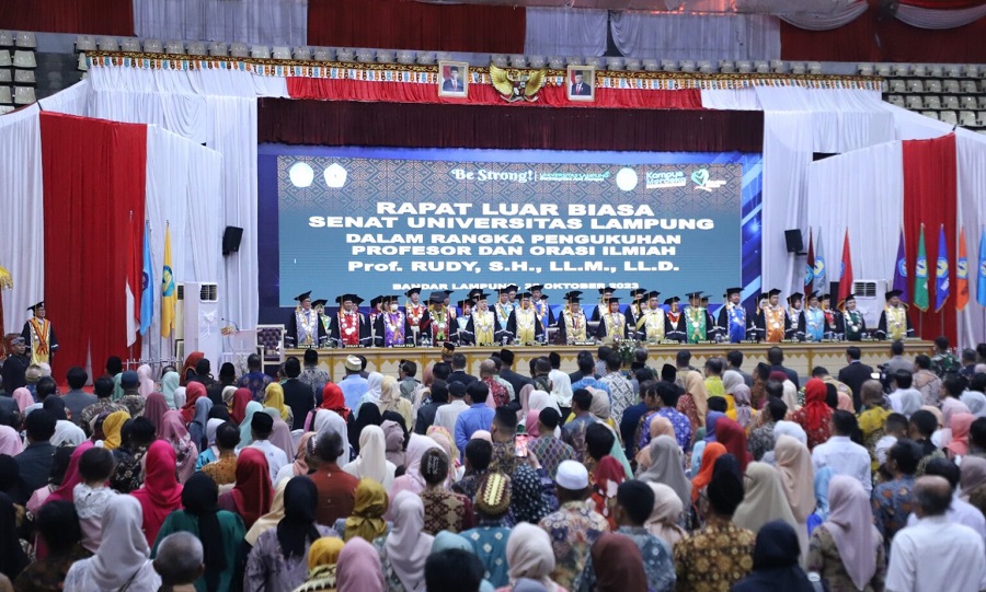 Newslampungterkini.com – Wakil Rekor Bidang Umum dan Keuangan Universitas Lampung (Unila) Prof. Rudy, S.H., LL.M., LL.D, dikukuhkan sebagai Guru Besar Bidang Ilmu Hukum pada Fakultas Hukum Unila. Upacara pengukuhan berlangsung di Gedung Serbaguna kampus Unila, Rabu, (25/10/2023).