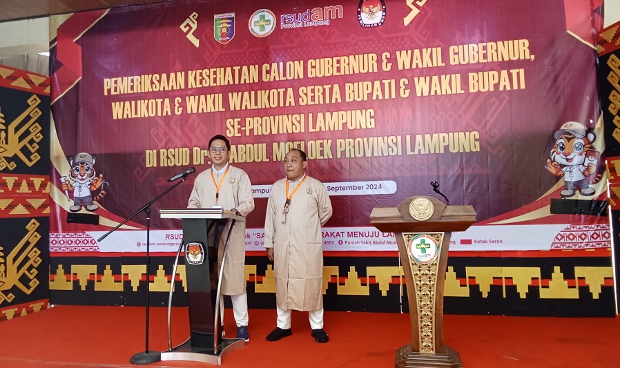 Newslampungterkini.com – Pasangan bakal calon bupati Lampung Selatan Radityo Egi Pratama dan bakal calon wakil bupati M Syaiful Anwar menjalani pemeriksaan kesehatan di Rumah Sakit Umum Daerah Abdoel Moeloek (RSUDAM), Senin (2/9/2024).