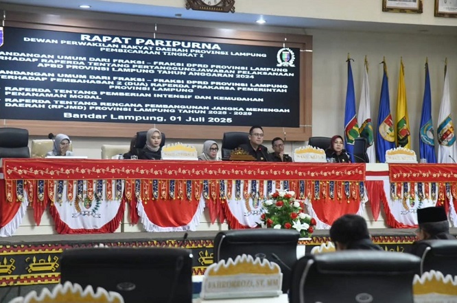 Rapat Paripurna DPRD ini beragenda pembicaraan Tingkat I tentang pandangan umum fraksi-fraksi DRPD terhadap Raperda tentang Pertanggungjawaban Pelaksanaan APBD Provinsi Lampung Tahun Anggaran 2024.