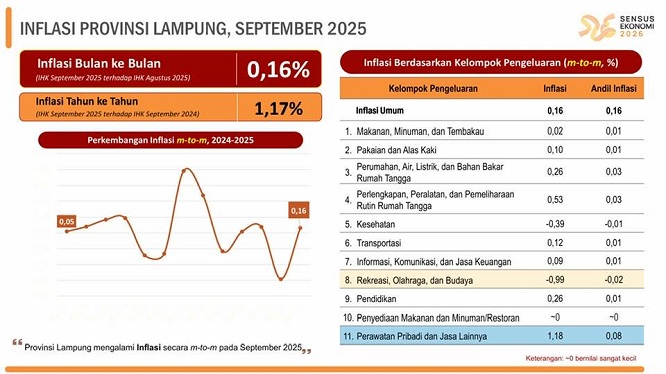 Newslampungterkini.com – Provinsi Lampung mencatat inflasi sebesar 0,16 persen secara bulanan (month to month/mtm) pada September 2025. Angka ini lebih rendah dibandingkan inflasi nasional yang berada di level 0,21 persen (mtm), menunjukkan stabilitas harga di daerah terus terjaga.
