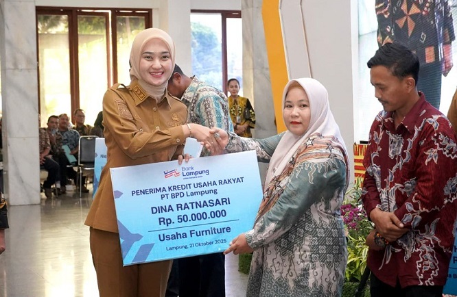 Newslampungterkini.com – Wakil Gubernur Lampung, Jihan Nurlela menyerahkan Kredit Usaha Rakyat (KUR) kepada empat perwakilan pelaku UMKM asal Lampung pada kegiatan Akad Massal KUR 800.000 Debitur untuk Penciptaan Lapangan Kerja dan Peluncuran Kredit Program Perumahan (KPP), di Mahan Agung, Bandar Lampung, Selasa (21/10/2025).