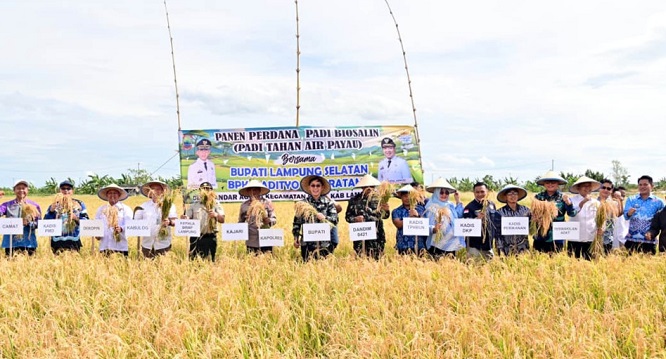 Apresiasi itu disampaikan Bupati Egi saat menghadiri Panen Raya Perdana Padi Varietas Biosalin di Desa Bandar Agung, Kecamatan Sragi, Kamis (6/11/2025).