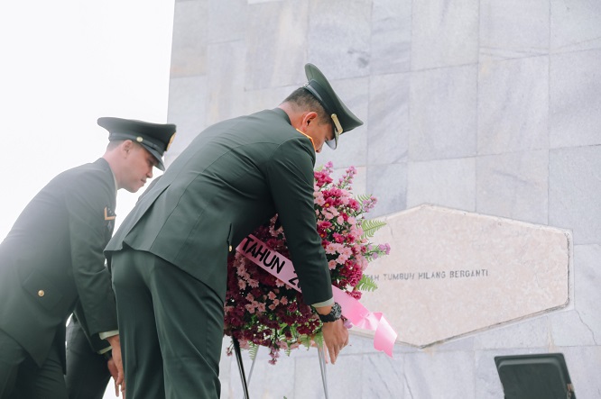 Suasana khidmat terasa ketika inspektur upacara melakukan prosesi peletakan karangan bunga di tugu makam pahlawan sebagai bentuk penghormatan dan ungkapan terima kasih atas pengorbanan para pahlawan.