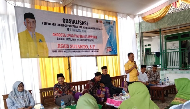 Newslampungterkini.com – Anggota DPRD Provinsi Lampung dari Fraksi Partai Golkar, Agus Sutanto, menggelar kegiatan Sosialisasi Pembinaan Ideologi Pancasila dan Wawasan Kebangsaan pertama pada Februari 2026.
