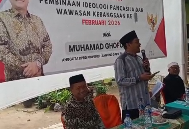 Newslampungterkini.comAnggota Komisi IV DPRD Provinsi Lampung, Muhamad Ghofur, menggelar kegiatan Sosialisasi Pembinaan Ideologi Pancasila dan Wawasan Kebangsaan (IPWK) di Majelis Taklim Pondok Pesantren Al-Ihya, Kecamatan Kalirejo, Kabupaten Lampung Tengah, Minggu (15/2/2026).