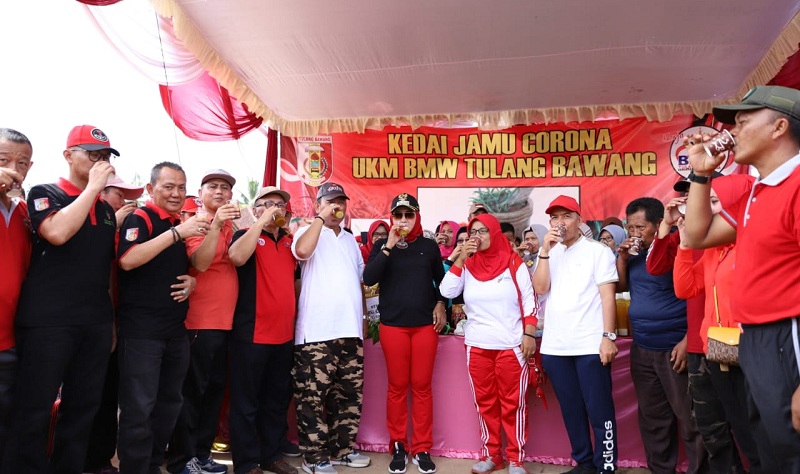 Begitu pula di Kabupaten Tulangbawang, saat kunjungannya ke-Kecamatan Banjar Agung dalam rangka monitoring 25 program unggulan pro-rakyat di Kampung-kampung, Bupati Tulangbawang Hj. Winarti SE MH bersama-sama masyarakat mengkampanyekan minum jamu tradisional sebagai cara meningkatkan kekebalan tubuh dan cara sehat secara alami.