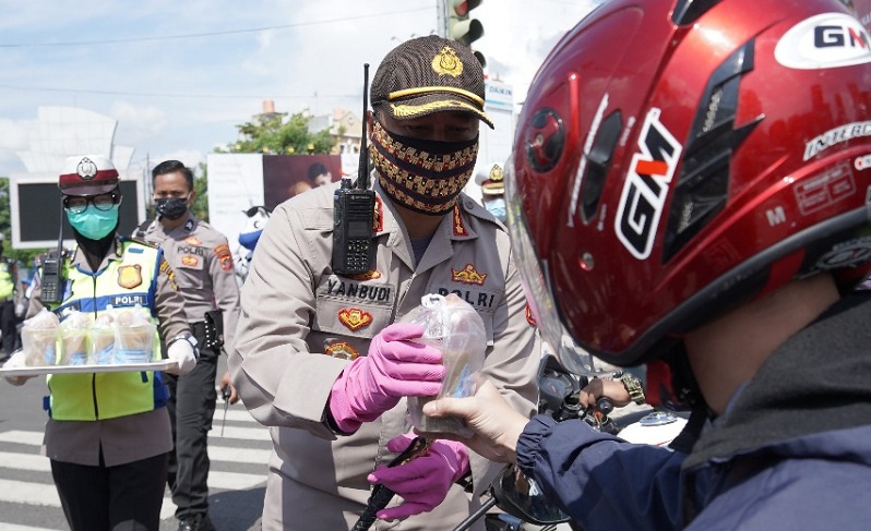 Dalam pembagian masker dan ekstra puding itu, juga menerjunkan Robot Satlantas yang menggunakan masker sebagai bentuk kampanye sosialisasi agar masyarakat paham penggunaan masker untuk melindungi diri sendiri dan orang lain,” bebernya.