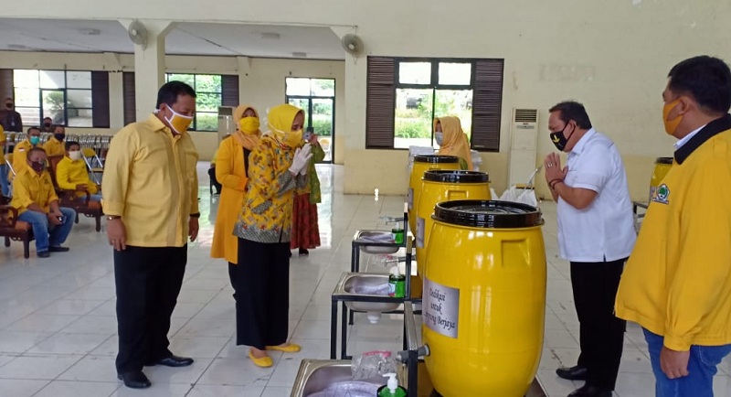 Newslampungterkini.com, Bandar Lampung – Peduli pencegahan Covid-19, Ikatan Istri Partai Golkar (IIPG) Provinsi Lampung, memberi bantuan 100 Wastafel Portable kepada DPD Partai Golkar Kabupaten/Kota se-Provinsi Lampung. Selain itu, DPD Partai Golkar Lampung juga membagi 15 ribu masker dan brosur himbauan Covid-19 serta bantuan paket sembako.