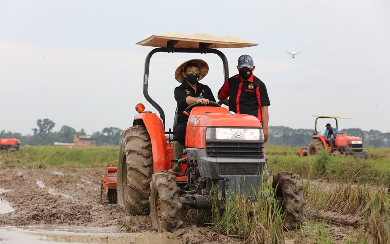 Acara diawali dengan mengemudikan traktor di hamparan sawah oleh Mentan bersama Gubernur Lampung Arinal Djunaidi dilanjutkan dengan menyaksikan olah tanah dan tanam padi dengan alat mesin pertanian (Alsintan).