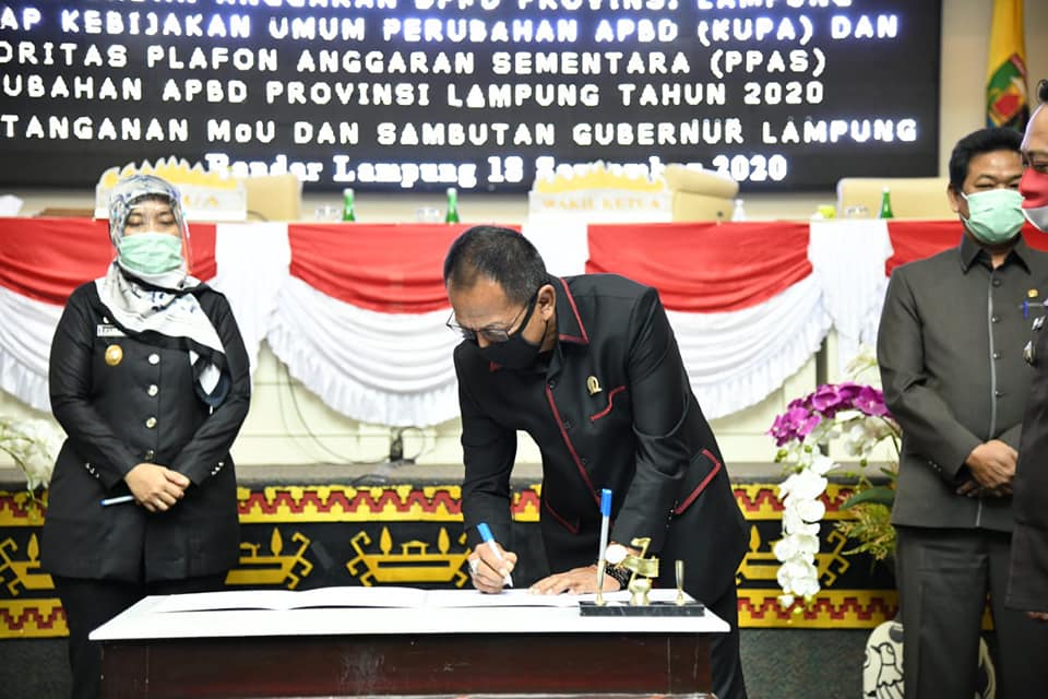 Newslampungterkini.com – Pemerintah Provinsi Lampung, melalui Wakil Gubernur Lampung Chusnunia Chalim (Nunik), menjelaskan adanya dampak Pandemi Covid-19 terhadap laju dan pertumbuhan perekonomian, baik di skala nasional maupun di Provinsi Lampung pada Penandatanganan Nota Kesepakatan Kebijakan Umum Perubahan APBD (KUPA) dan Prioritas Plafon Anggaran Sementara (PPAS) Perubahan APBD  Tahun Anggaran 2020, dalam Sidang Paripurna DPRD Provinsi Lampung, Jumat (18/9/2020).