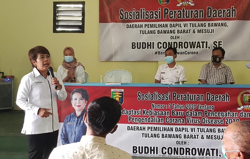 Newslampungterkini.com – Anggota DPRD Provinsi Lampung, Budhi Condrowati menggelar Sosialisasi Perda (Sosper) Nomor 3 Tahun 2020, tentang Adaptasi Kebiasaan Baru dalam Pencegahan dan Pengendalian Corona Virus Disease 2019 di Tiyuh Margo Mulyo, Tumijajar, Tulangbawang Barat (Tubaba). Rabu (28/1/2021)