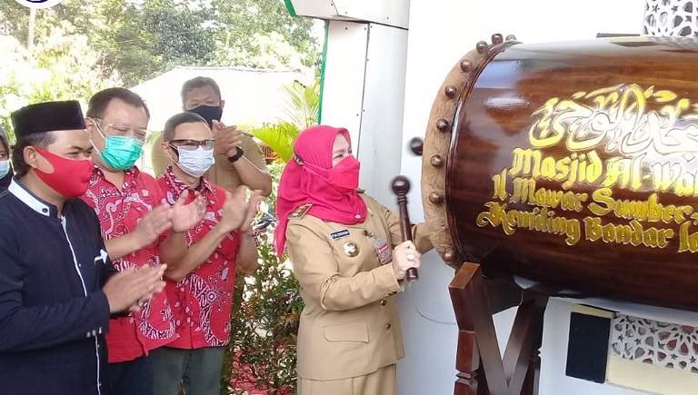 Walikota Bandar Lampung Eva Dwiana beserta Kepala Dinas Sosial Pemerintah Kota Bandar Lampung turut hadir dan menyerahkan Beduk secara simbolis kepada pengurus Masjid Al-Wahyu.