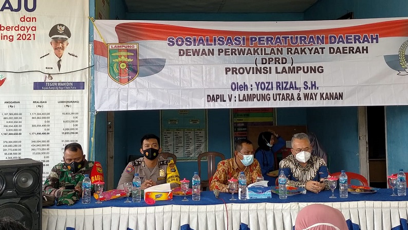 Newslampungterkini.com – Ketua komisi I DPRD Provinsi Lampung Yozi Rizal, S.H. menggandeng Tim Penyuluh Hukum Kanwil Kemenkumham Lampung mengadakan Sosialisasi Perda Provinsi Lampung Nomor 3 Tahun 2020 tentang Adaptasi kebiasaan baru dalam pencegahan dan pengendalian Corona Virus Disease (Covid) 19 di Kampung Negeri Bumi Putra Kecamatan Umpu Semenguk Kabupaten Way Kanan pada Sabtu (13/03/2021).