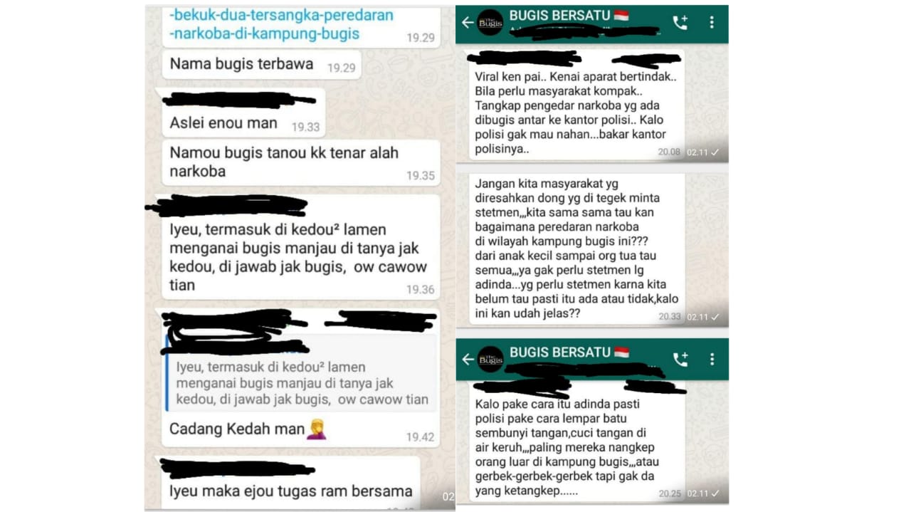 “Kami warga sangat resah dengan adanya peredaran narkoba di Kampung Bugis yang sangat kami cintai ini, tidak cuma Bapak-bapak ataupun Ibu-ibu, anak kecilpun tau kalo peredaran narkoba sudah seperti jual beli kacang goreng,” ungkapnya.