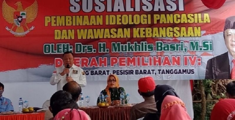 Newslampungterkini.com – Anggota DPRD Provinsi Lampung Mukhlis Basri, mensosialisasikan Pembinaan Ideologi Pancasila dan Wawasan Kebangsaan, di Sekretariat Lembaga Kesejahteraan Sosial (LKS) Alamanda Pekon Gisting Atas, Tanggamus. Jumat (04/06/2021).