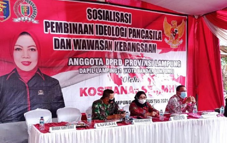 Newslampungterkini.com – Anggota DPRD Provinsi Lampung Kostiana SE MH sosialisasi Ideologi Pancasila dan Wawasan Kebangsaan di Labuhan Ratu, Bandar Lampung, Minggu (29/8/2021).