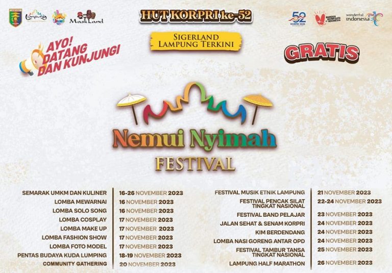 Berita Terkini Provinsi Lampung Festival Nemui Nyimah 2023, Semarakkan Lampung dengan Kearifan Lokal dan Kreatifitas 16 November 2023 News Lampung Terkini Newslampungterkini.com – Pemerintah Provinsi Lampung akan menyelenggarakan Festival Nemui Nyimah 2023, sebuah event Road to…