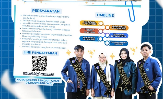 Berita Terkini Kampus UPA Perpustakaan Unila Buka Pendaftaran Duta Baca Tahun 2026 7 April 2026 News Lampung Terkini Newslampungterkini.com – Unit Penunjang Akademik (UPA) Perpustakaan Universitas Lampung (Unila) secara resmi membuka pendaftaran pemilihan…